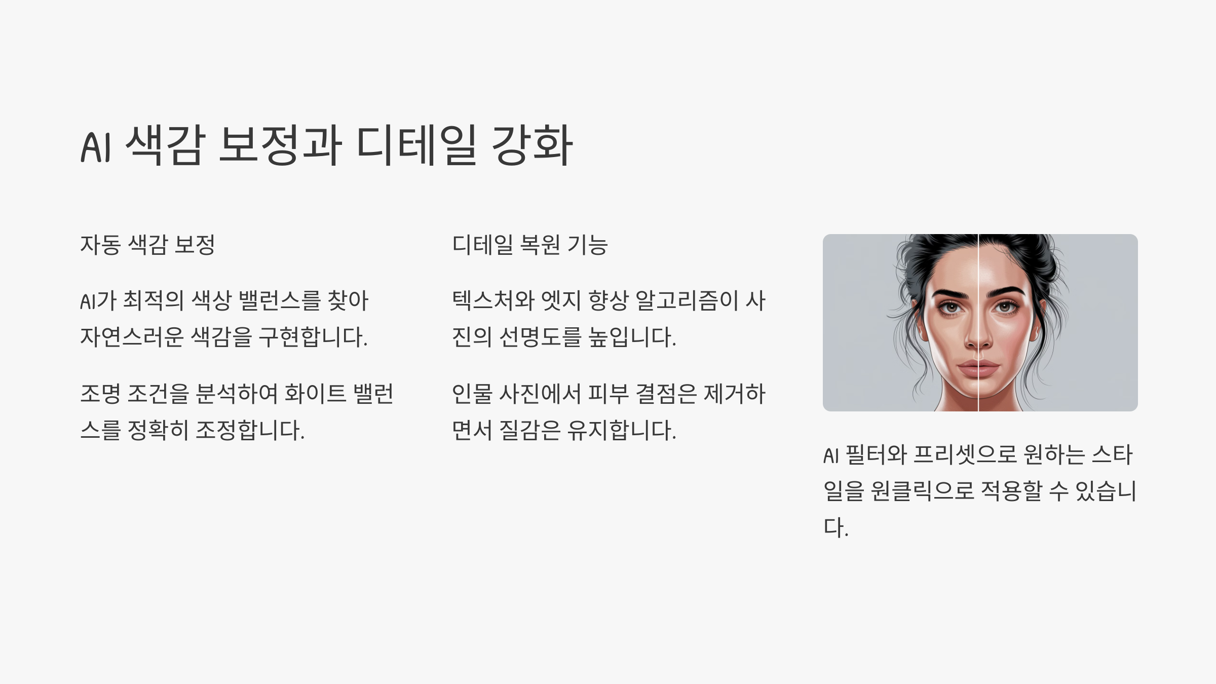 | AI 색감 보정 | 밝기, 색온도, 대비 등을 자동으로 최적화 |