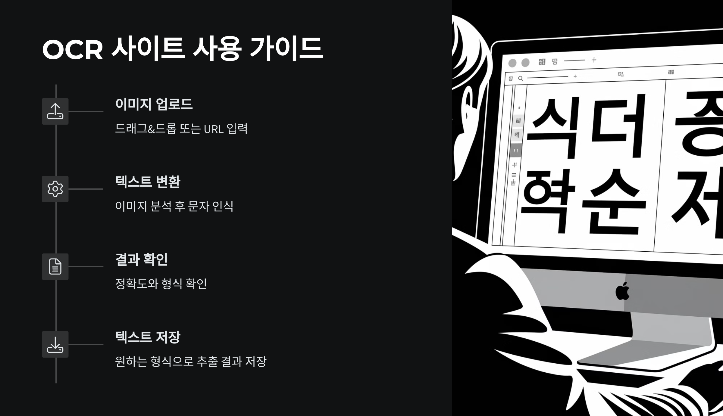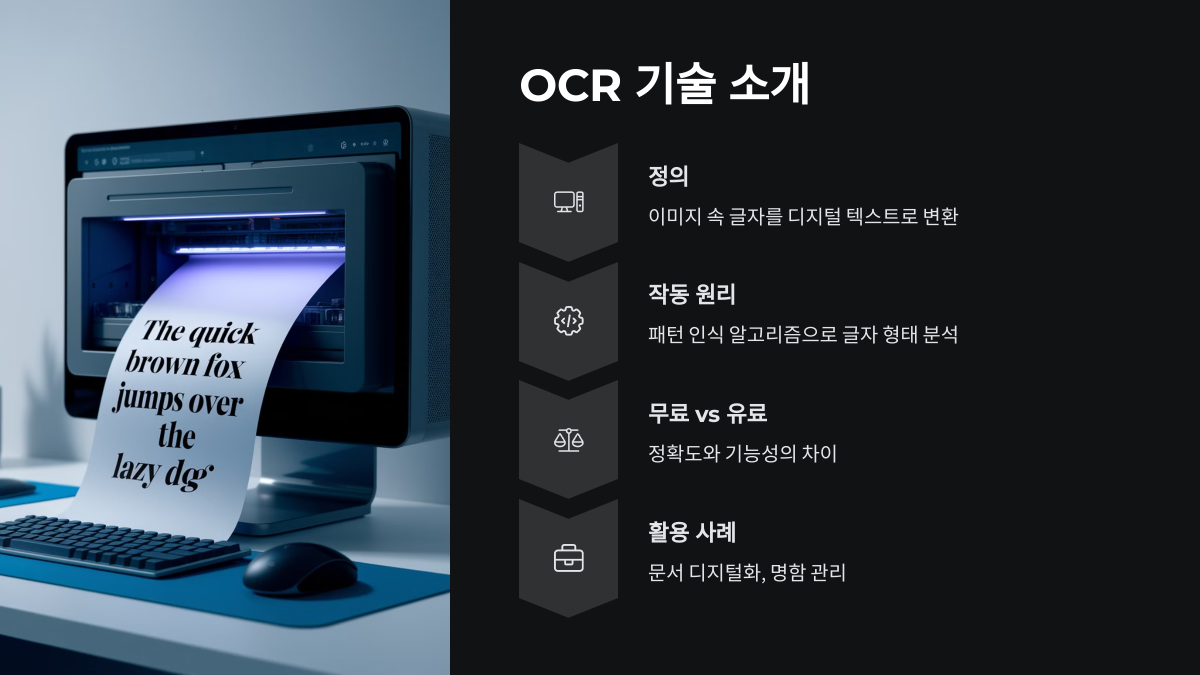 A: OCR(Optical Character Recognition)은 이미지나 PDF 문서 속 글자를 분석하여 편집 가능한 텍스트로 변환하는 기술입니다.
